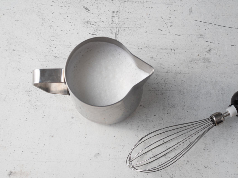 Mleko podgrzej, przelej do wysokiego naczynia i spień. Możesz użyć spieniacz w ekspresie do kawy, ręczny spieniacz lub blender z wymienną końcówką do ubijania.