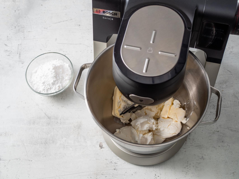 W misie miksera umieść serek kanapkowy i miękkie masło. Wsyp cukier puder. Ucieraj około 5 minut minut, aż składniki się połączą na jasną i puszystą masę.