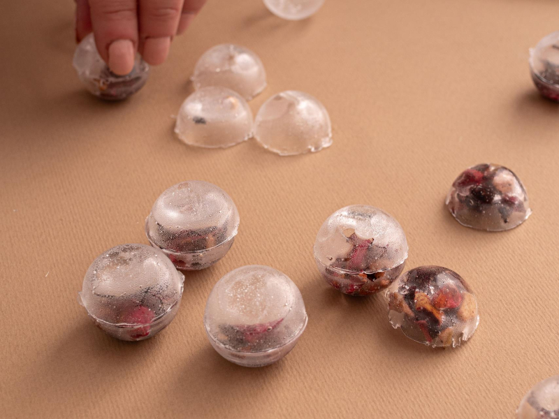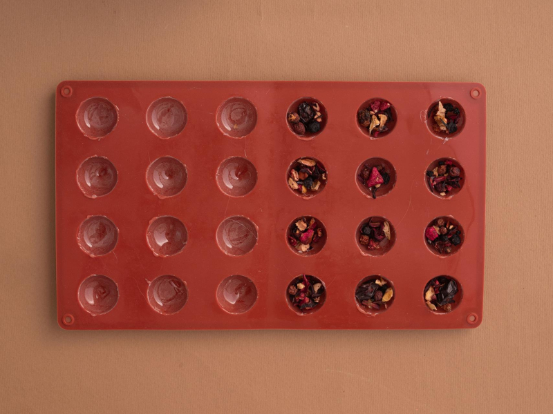 Do każdej półkuli od razu wsyp suszoną mieszankę herbaty tak, aby przykleiła się do izomaltu zanim zastygnie. Każdą półkulę wypełniaj pojedynczo.