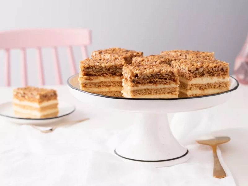 Miodowe blaty przekładane budyniem i chrupiącymi, karmelizowanymi orzechami. Brzmi kusząco, prawda? To jedno z tych ciast, które koniecznie należy przygotować w większej formie - znika z prędkością światła!