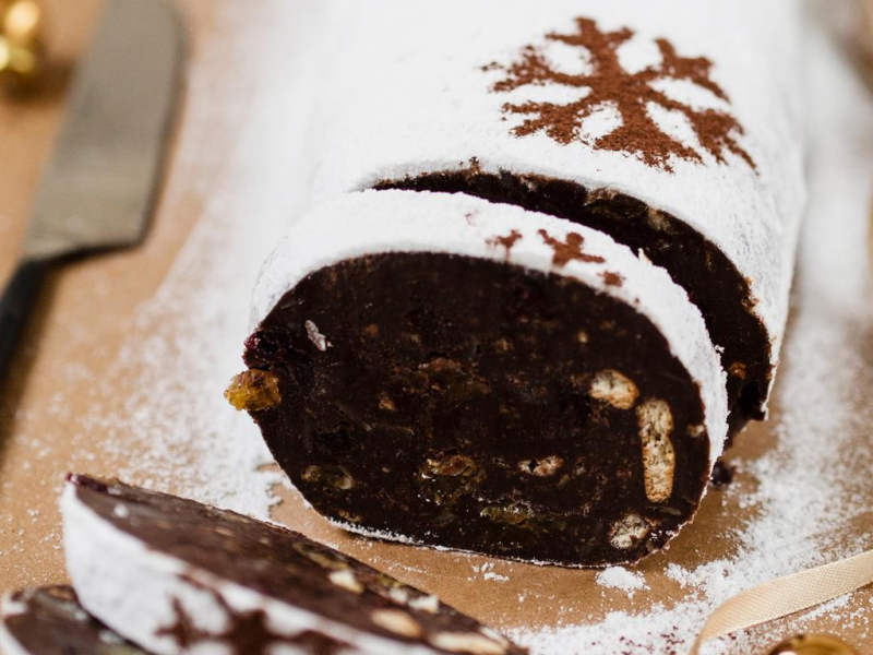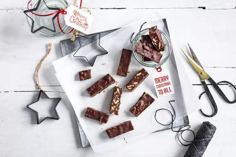 Masa z mleka w proszku, masła i kakao, obficie wypełniona orzechami, suszonymi owocami i chrupiącymi herbatnikami. Wykorzystaj świąteczny szablon lub foremkę, żeby ozdobić gotowy blok czekoladowy!