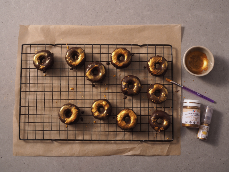 Złoty barwnik w proszku rozpuść w niewielkiej ilości alkoholu (wystarczy kilka-kilkanaście kropli). Pędzelkiem pomaluj zastygłą czekoladę lub nakrop delikatnie donuty, strząsając na nie nadmiar barwnika.