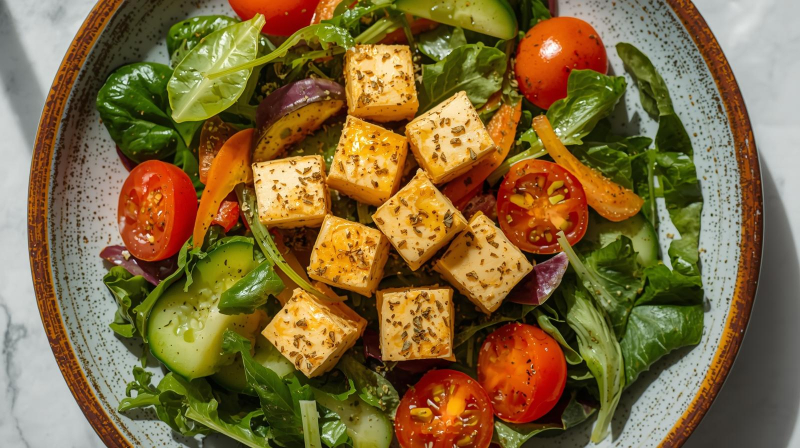 sałatki z dodatkiem strączków, tofu lub tempehu