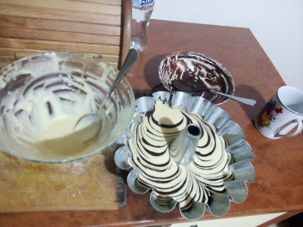Do wysmarowanej masłem formy nakładaj na przemian po parę łyżek ciemnego i jasnego ciasta.