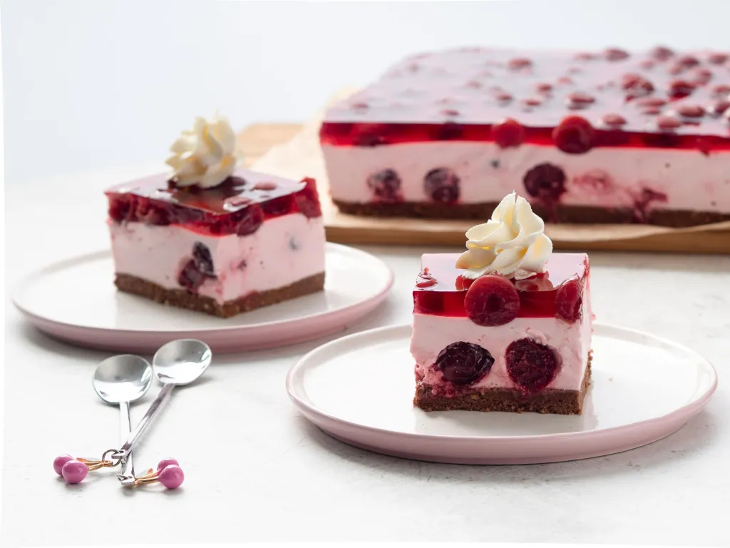 Kiedy krem st臋偶eje, przelej galaretk臋 z wi艣niami na wierzch ciasta.