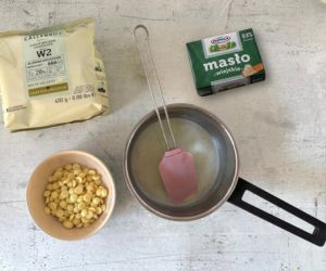 Białą czekoladę zalej roztopionym, ciepłym masłem. Wymieszaj.