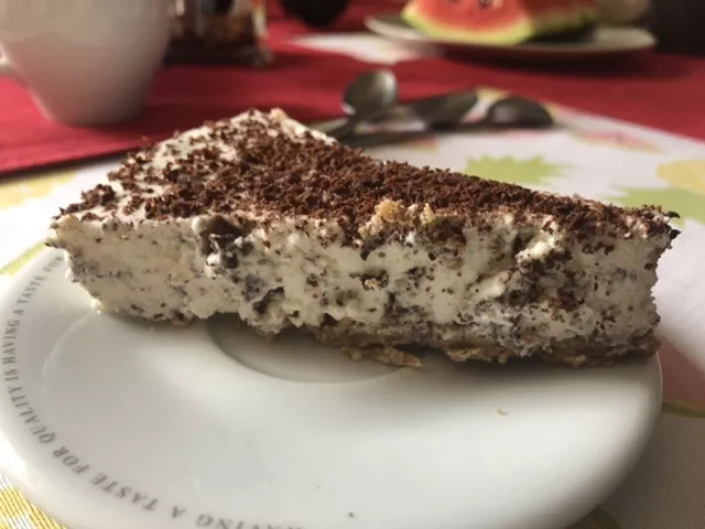 Pozostałą ilość śmietanki wymieszaj za pomocą miksera z twarogiem i cukrem pudrem. Następnie dodaj jeszcze ciepłą śmietankę z żelatyną. Wymieszaj szybko i dokładnie. Na koniec wmieszaj drobno pokrojoną czekoladę. Masę przełóż do formy i wyrównaj.