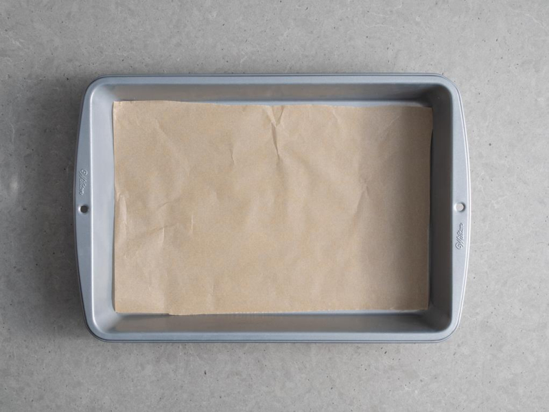 Dno formy o wymiarach 23 x 33 cm wyłóż papierem do pieczenia.