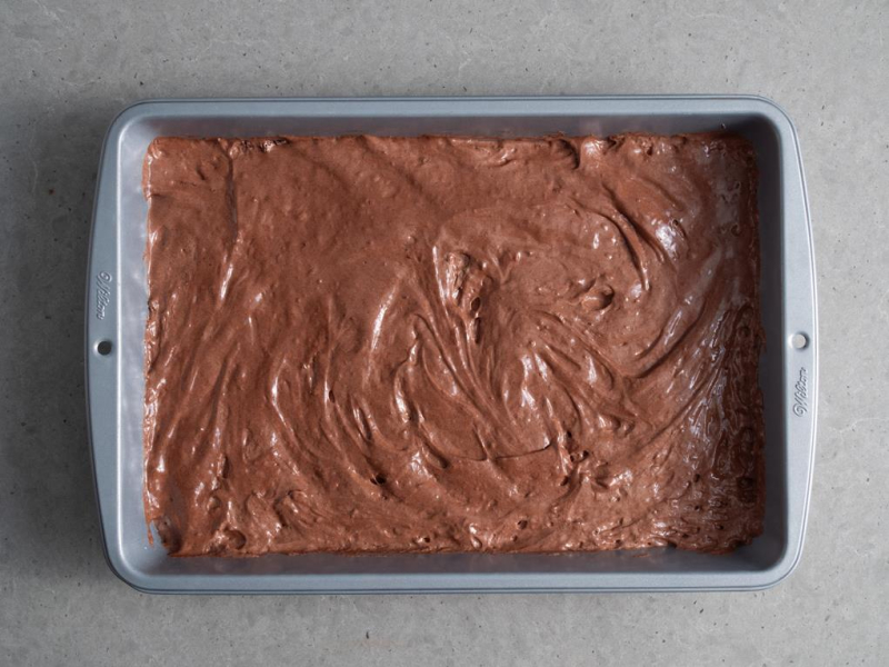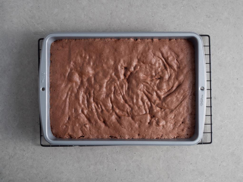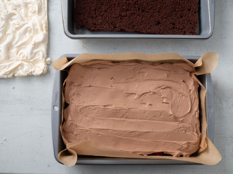 Krem przełóż na kakaowy biszkopt, wyrównaj powierzchnię szpatułką.