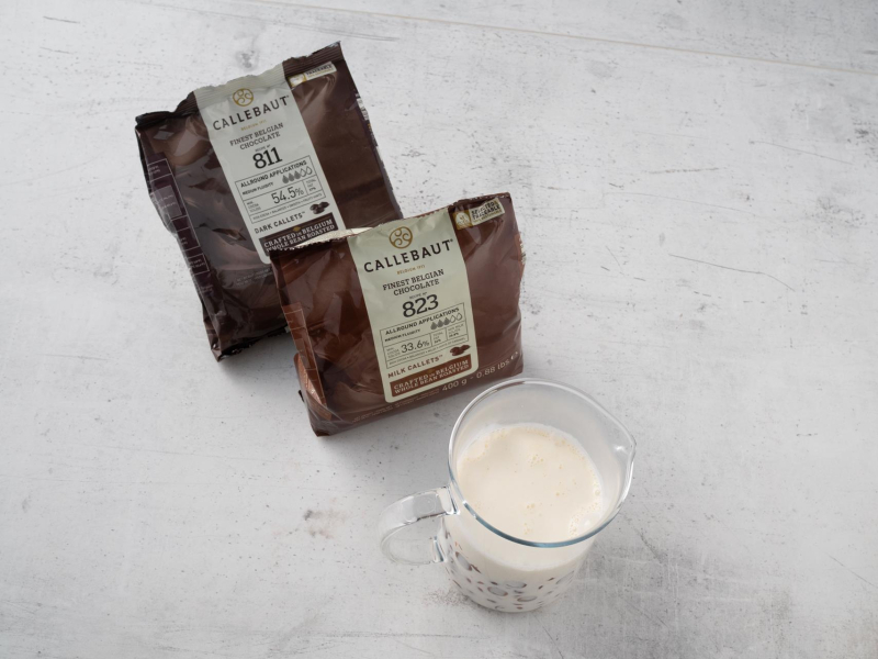Gorącą śmietanką zalej czekolady (mleczną i ciemną). Wymieszaj dokładnie kidy czekolada się rozpuści, odstaw do schłodzenia do lodówki.