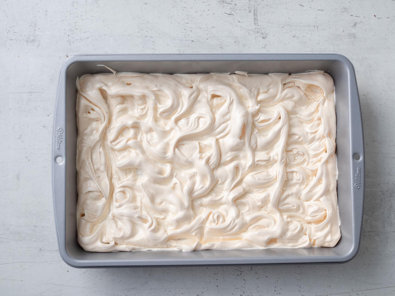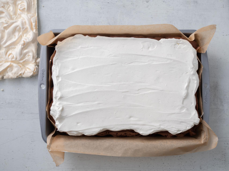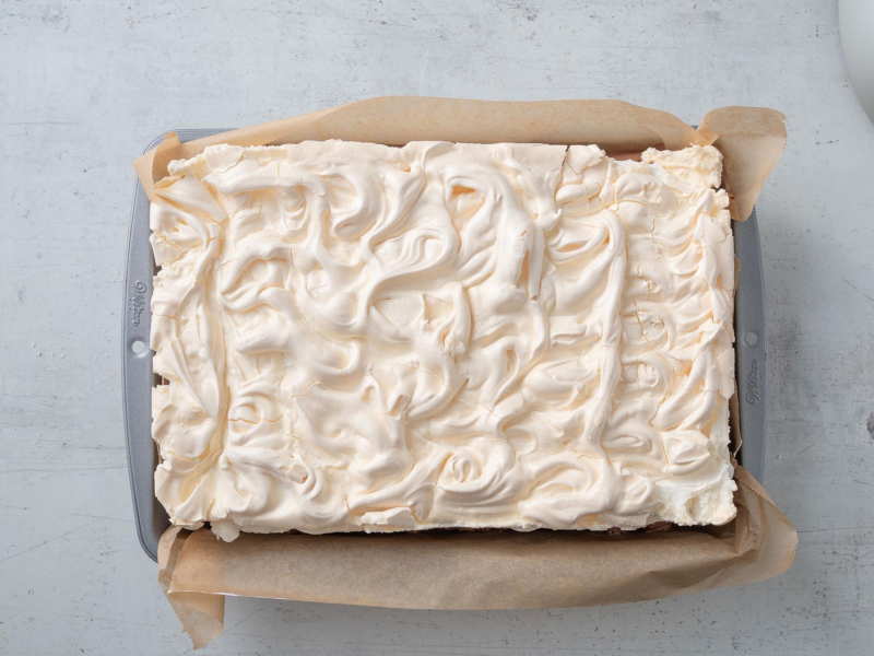 Bezę wyłóż na tą samą fomę. Piecz w rozgrzanym piekaniku do 120°C przez 70 minut.