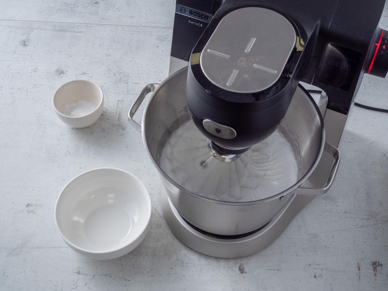 Białka przelej do misy razem cukrem i ubijaj przez kilkanaście minut do uzyskania sztywnej bezy. Pod koniec ubijania, kiedy cukier całkowicie się rozpuści, wmiksuj mąkę ziemniaczaną.