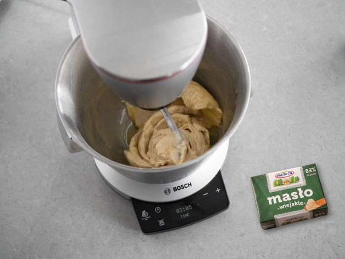 Pod koniec dodaj rozpuszczone masło i zagniataj do połączenia się składników.