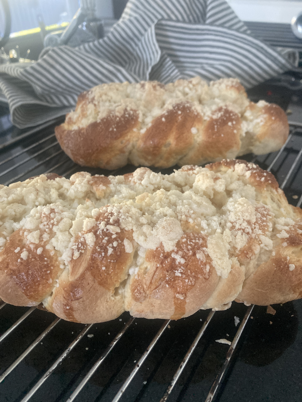 Ciasto drożdżowe z powodzeniem możesz zagnieść wieczorem i pozostawić na noc w lodówce w misce przykrytej bawełnianą ściereczką do wyrośnięcia. O poranku wyjmujesz ciasto aby się ogrzało, dzielisz na dwie części, z każdej formujesz podłużne kawałki w kształcie cienkich bagietek i… rozpoczyna się magia! 😊 Chałkę drożdżową przed pieczeniem posmaruj roztrzepanym jajkiem, posyp kruszonką i możesz nakrywać do stołu!