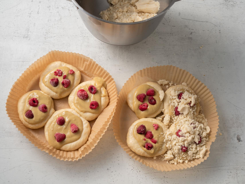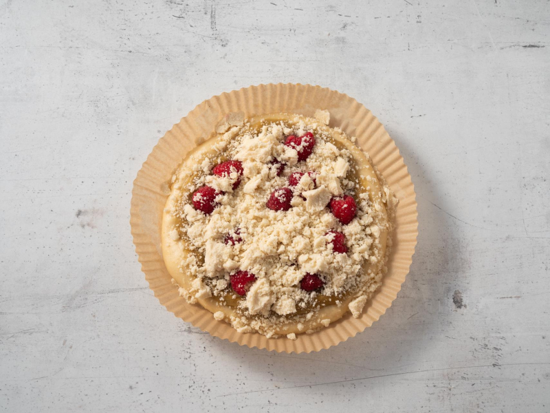 Jeśli w dużej, ciasto podziel na dwie części i wyłóż na dwóch papierowych formach do pieczenia. Kulkę spłaszcz i rozprowadź na dnie formy, na każdej z nich wyłóż połowę porcji kremu budyniowego, maliny i kruszonkę.