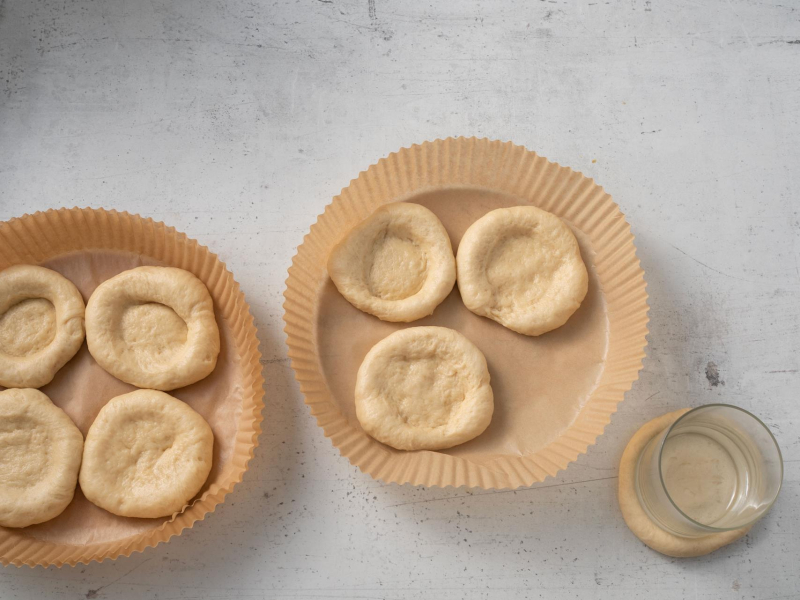 Ciasto podziel na osiem mniejszych porcji, w zależności czy chcesz zrobić bułeczki w małej lub dużej wersji. Na foremkach do airfryera wykładaj spłaszczone kulki z ciasta, srodek lekko dociśnij szklanką, tworząc wyższe brzegi bułeczek.