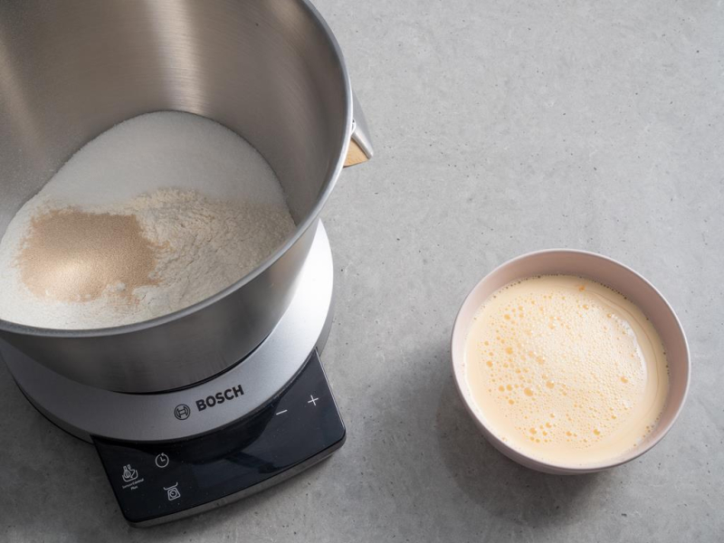 Do miski przesiej mąkę i dokładnie wymieszaj, dodaj drożdże, cukier i cukier wanilinowy.