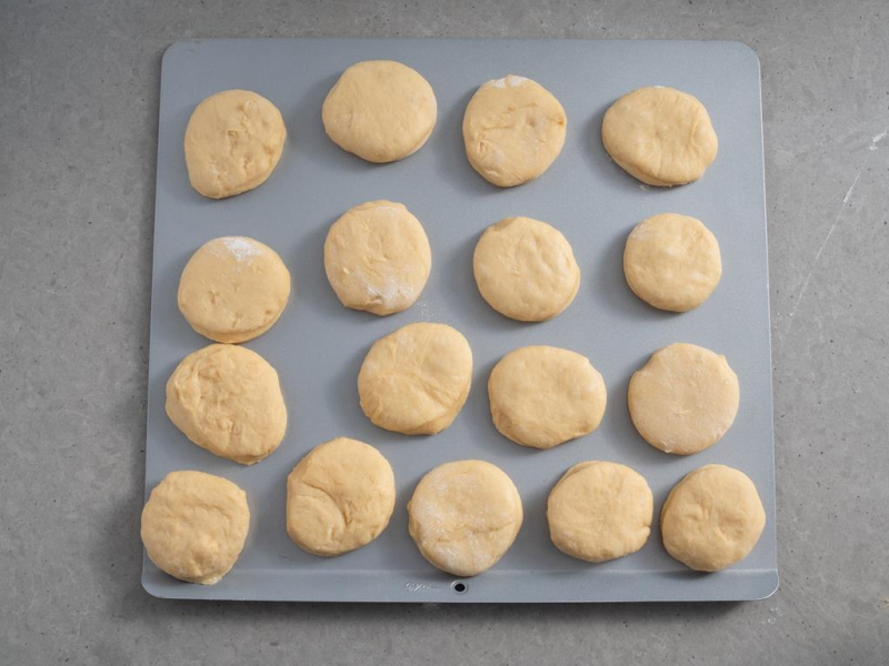 Rozwałkuj na grubość około 1 cm i wycinaj przy pomocy ringu lub szklanki. Pozostaw pod przykryciem do ponownego wyrośnięcia na około 30 minut.