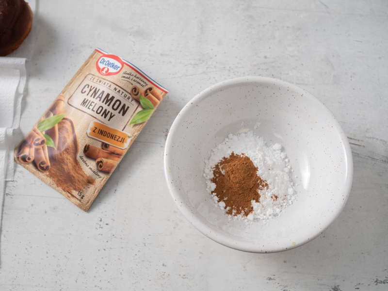 Drobny cukier wymieszaj z cynamonem i obrataczaj z obu stron jeszcze ciepłe pączki.