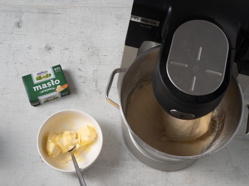 Do zagniatanego ciasta dodawaj porcjami miękkie masło.