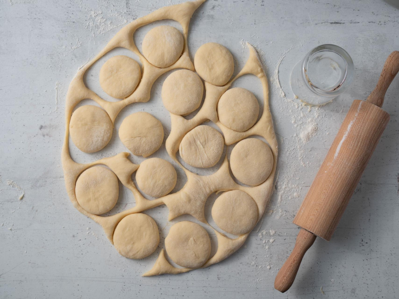 Wyrośnięte ciasto rozwałkuj na blacie na grubość około 1,5 cm i przy pomocy szklanki lub ringu wycinaj kształat pączków. Ponownie przykryj i pozostaw do wyrośnięcia.