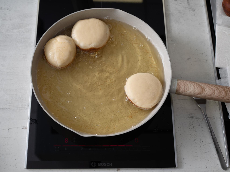Smaż z każdej strony do zarumienienia się pączka. Pamiętaj, że tłuszcz nie może być rozgrzany zbyt mocno.