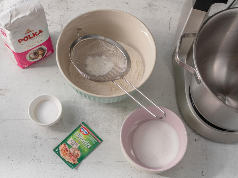 Mąkę przesiej do miski, wymieszaj z drożdżami, cukrem i solą.
