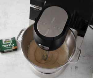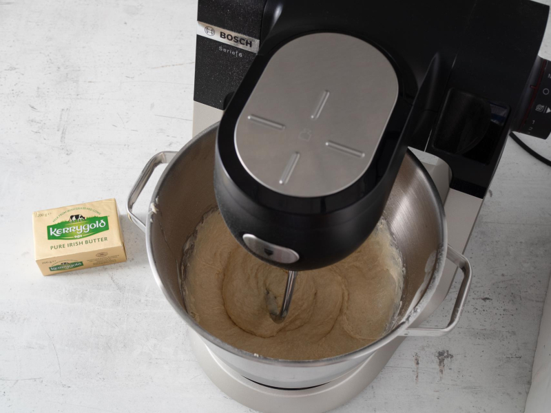 Dodaj jajka i mleko, zagnieć. Na końcu miękkie masło, zagniataj do uzyskania sprężystej, jednolitej konsystencji.