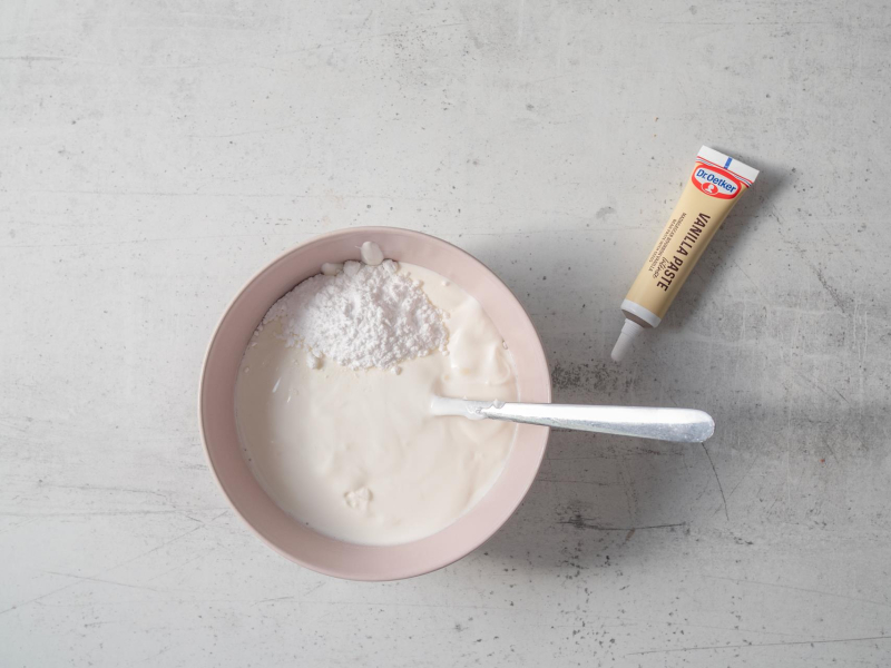 Śmietanę wymieszaj z przesianym cukrem pudrem i pastą z wanilii.