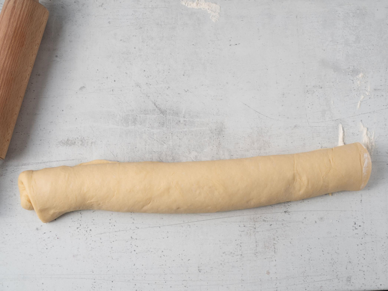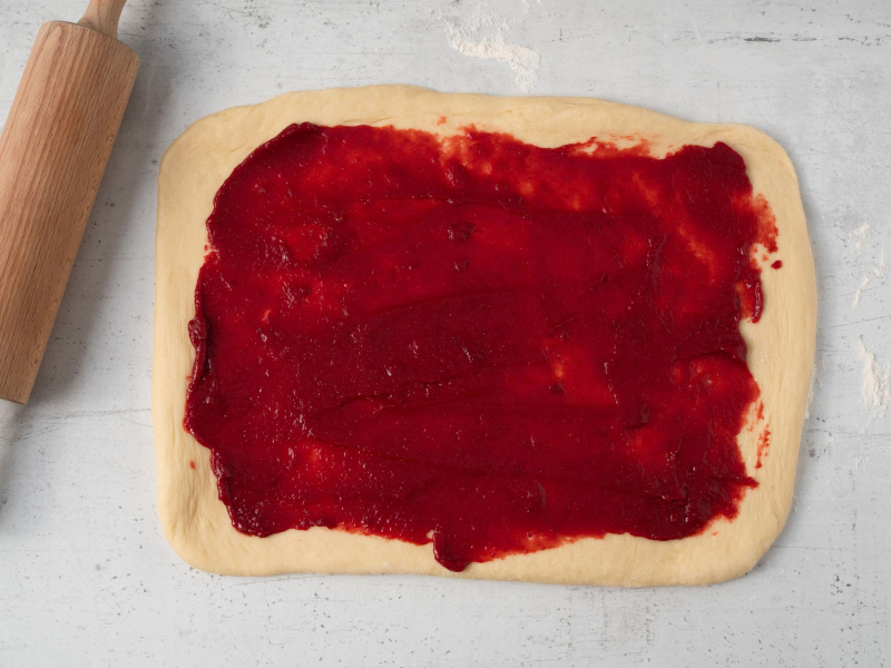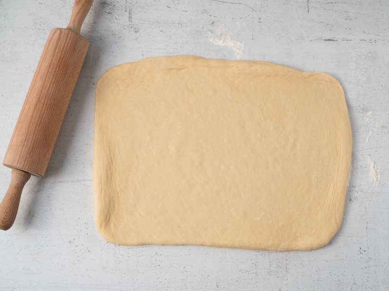 Wyrośnięte ciasto rozwałkuj na prostokąt, podsypując blat niewielką ilością mąki.