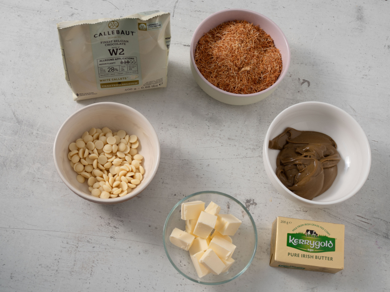 Masło, pastę pistacjową i czekoladę rozpuść w mikrofali, dodaj cukier i wymieszaj. Odstaw do przestudzenia. Na końcu wmieszaj prażone ciasto kataifi.