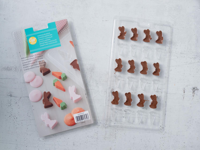 Rozpuszczoną czekoladę przełóż do worka i wypełnij foremki, odstaw do lodówki.