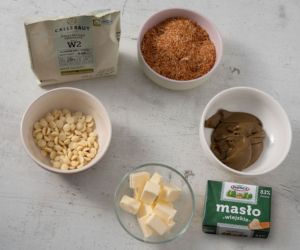 Masło, pastę pistacjową i czekoladę rozpuść w mikrofali, dodaj cukier i wymieszaj. Odstaw do przestudzenia. Na końcu wmieszaj prażone ciasto kataifi.