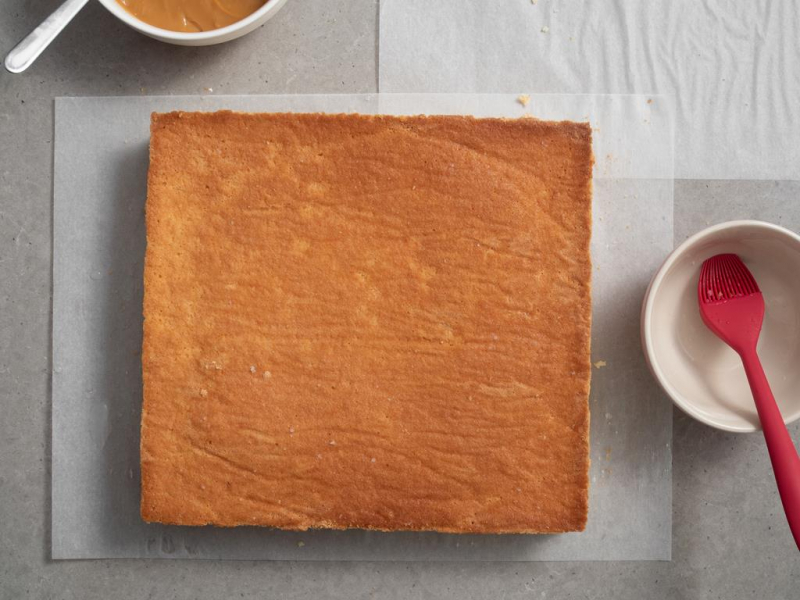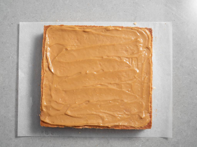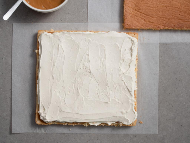 Połowę porcji masy kajmakowej rozsmaruj równomiernie na biszkopcie.