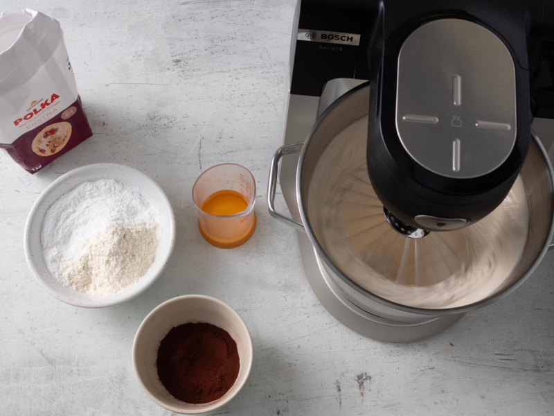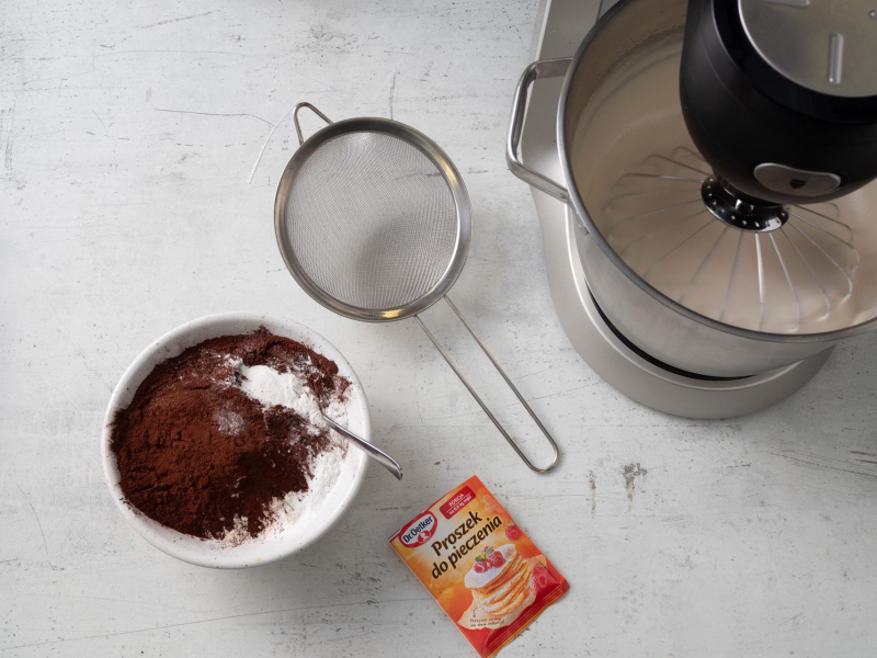Mąkę przesiej ze skrobią, wymieszaj z proszkiem do pieczenia, kakao i wmiksuj bardzo krótko do masy jajecznej, tylko do połączenia się składników.