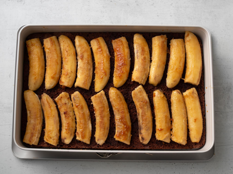 Banany przekrój wzdłuż i na pół, poukładaj je na nasączonym biszkopcie.