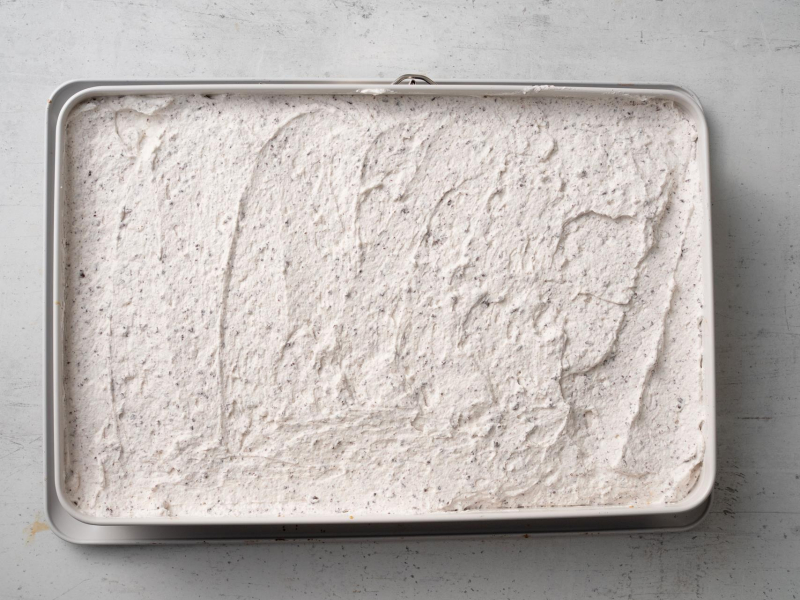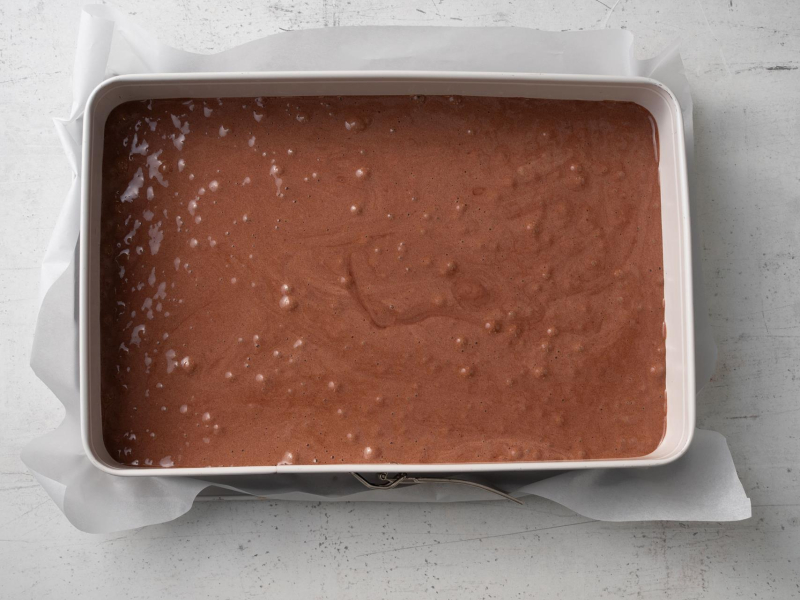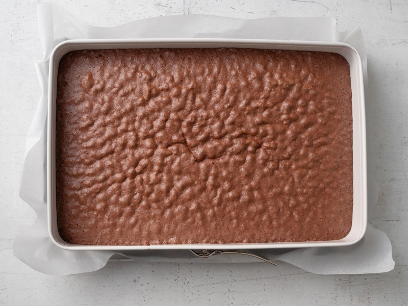 Ciasto biszkoptowe przelej do formy o wielkości 25 x 38 cm.