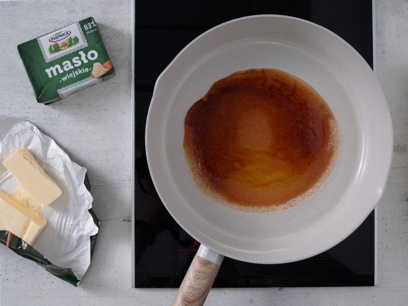 Na rozgrzanej patelni rozpuść masło, przesyp cukier. Podgrzewaj do momentu całkowitego rozpuszcznia się cukru.