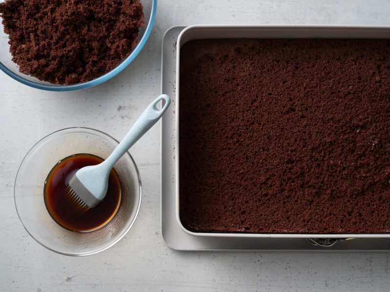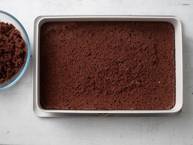 Upieczony biszkopt zetnij z góry, na około 1 cm. Górną warstwę pokrusz do oddzielnej miseczki.