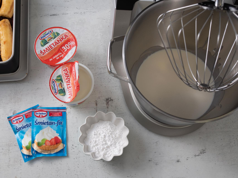 Śmietankę przelej do misy miksera. Ubij, pod koniec dodając wymieszany cukier puder ze śmietan fixami.
