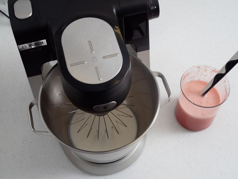 Galeretki rozpuść i odstaw do wystudzenia. Kiedy galaretka zacznie tężeć zblenduj ją z truskawkami.