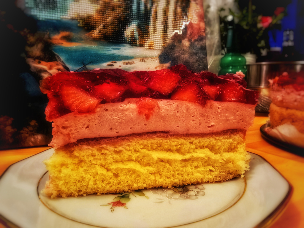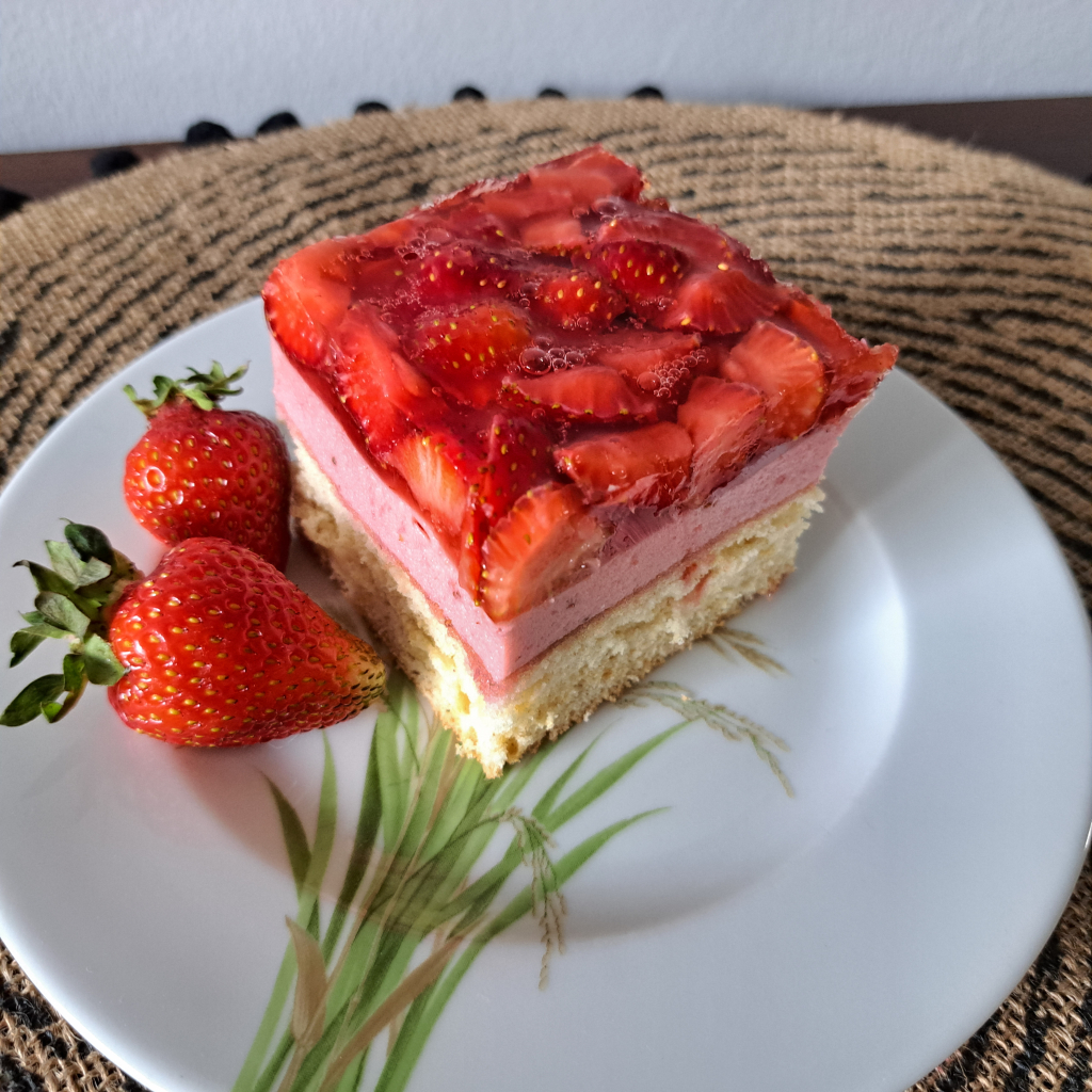 Lekki i orzeźwiający mus truskawkowy na puszystym biszkopcie nasączonym galaretką ze zblendowanymi owocami. Na wierzchu nie mogło oczywiście zabraknąć drobno pokrojonych świeżych owoców i truskawkowej galaretki.