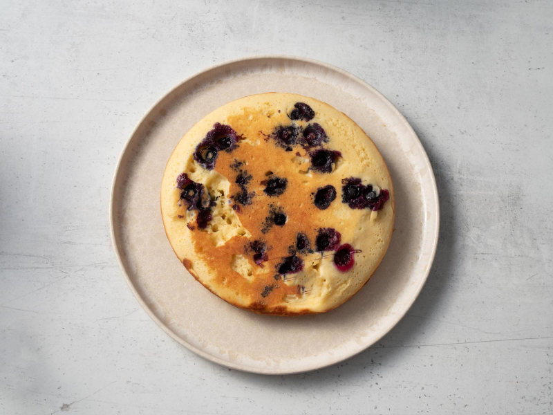 Ciasto przed obróceniem powinno odchodzić od brzegów patelni, być widocznie ścięte i wyrośnięte od dołu. Wierzch posyp borówkami lub innymi drobnymi owocami lub kawałkami owoców.