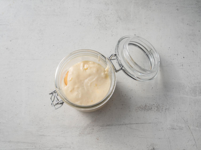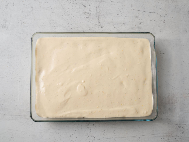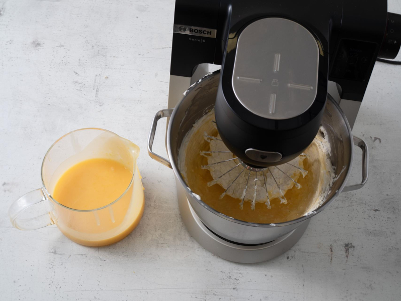 Z porcji lemon curd odlej 200 ml do wylania na wierzch deseru. Pozostałą porcję przelej do ubitego kremu mascarpone. Zminksuj tylko do połączenia.