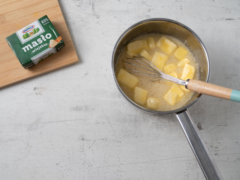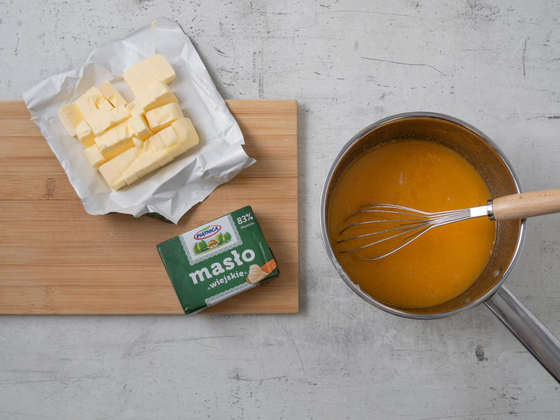 Ściągnij z palnika i wmieszaj masło. Odstaw do wystudzenia.