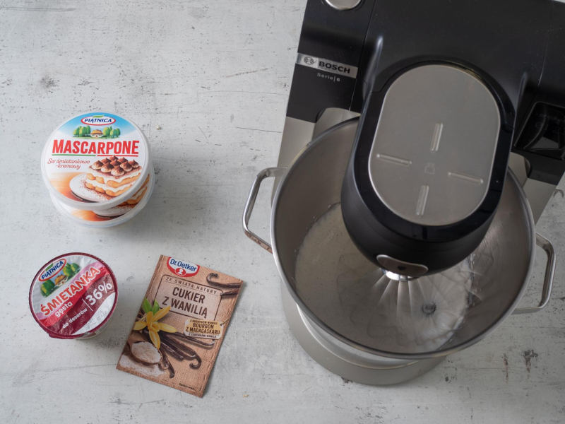 Serek mascarpone przełóż do miski, przelej schłodzoną śmietankę i dodaj cukier z wanilią.