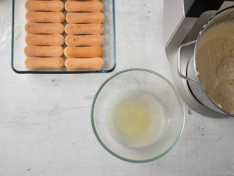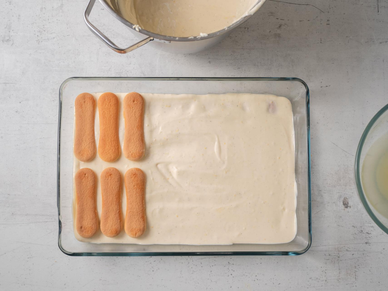 Podłużne biszkopty nasącz, zanużając przez moment do połowy w wodzie wymieszanej z sokiem z cytryny. Poukładaj na dnie naczynia.