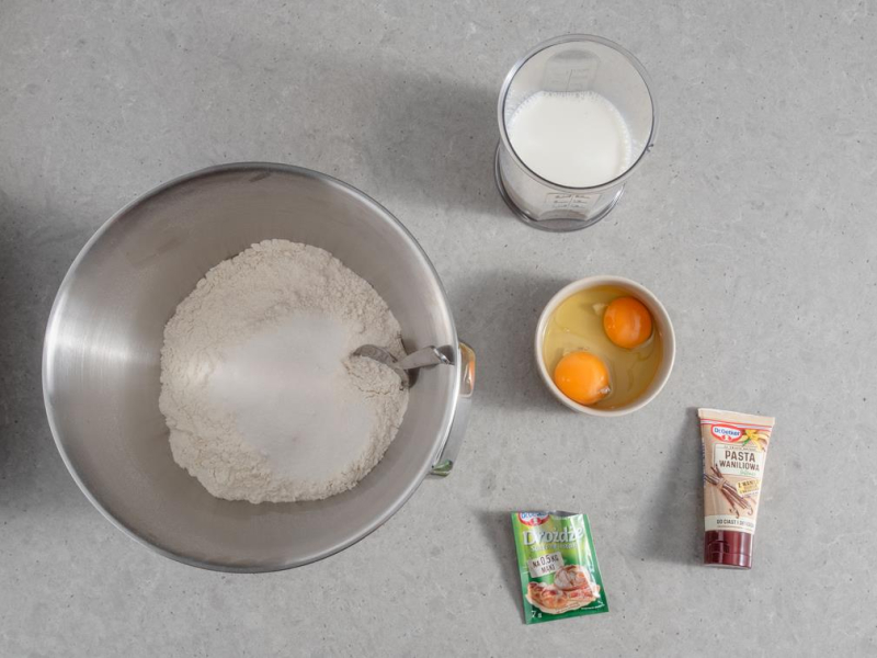 Mąkę przesiej do miski, dodaj drożdże, cukier, pastę waniliową i szczyptę soli, wymieszaj. Następnie dodaj ciepłe mleko i jajka, wyrabiaj mikserem z końcówką do ciasta drożdżowego.