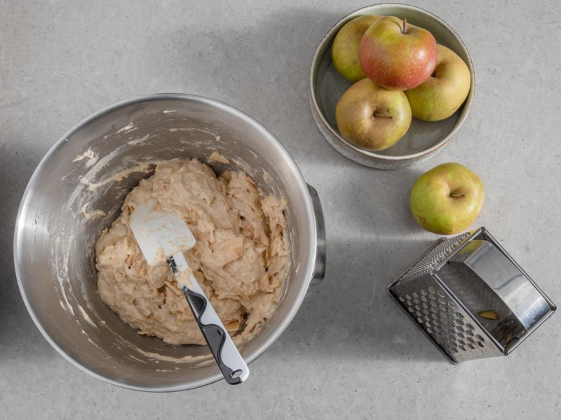 Odstaw ciasto w ciepłe miejsce do podwojenia objętości na około 45 minut. Ciasto powinno być luźne i powoli spływać z łyżki. Do ciasta dodaj starte jabłka i delikatnie wymieszaj.