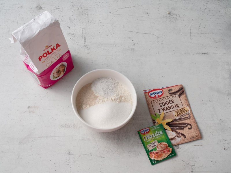 Mąkę przesiej do miski, wymieszaj z drożdżami, cukrem i cukrem z wanilią.